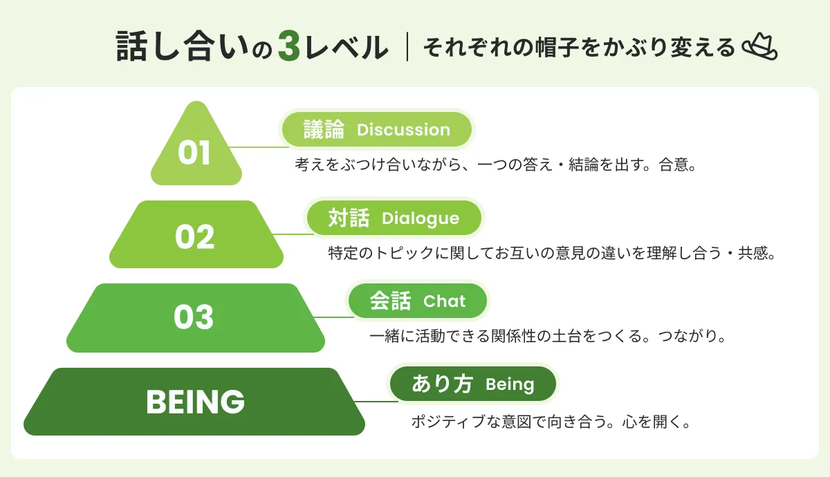 対話とは、特定のトピックに関してお互いの意見の違いを理解しあうことです。