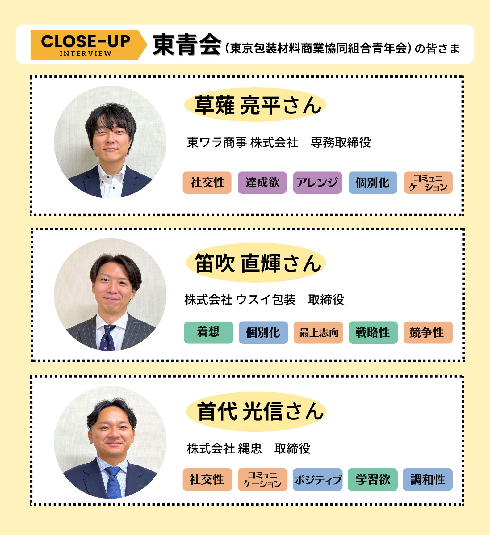 記念すべき第10回目となる今回は、東京包装材料商業協同組合の青年会にあたる「東青会(とうせいかい)」のみなさんです。