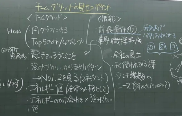 参加者から実際のチームグリッドをお借りして、3グループに分かれてチームグリッドの見立てを行いました。
