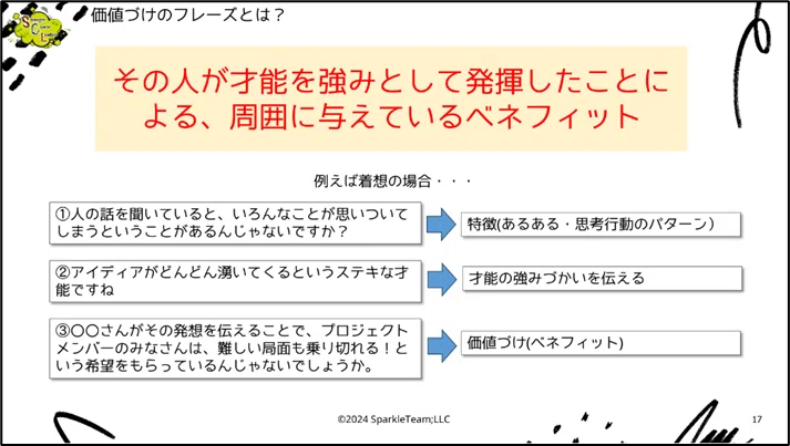 ▶ そのなかで「〇〇さんの“親密性”が支えになっている」や「△△さんの“ポジティブ”を少し端に除けて」など、物理的に資質名を使いながら、資質や資質名に親しみを持ってもらえるといいな~