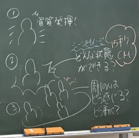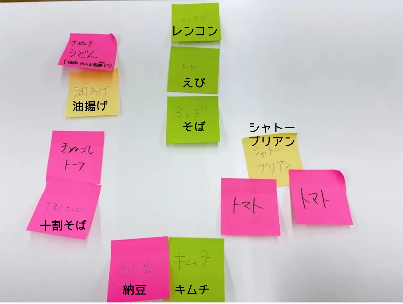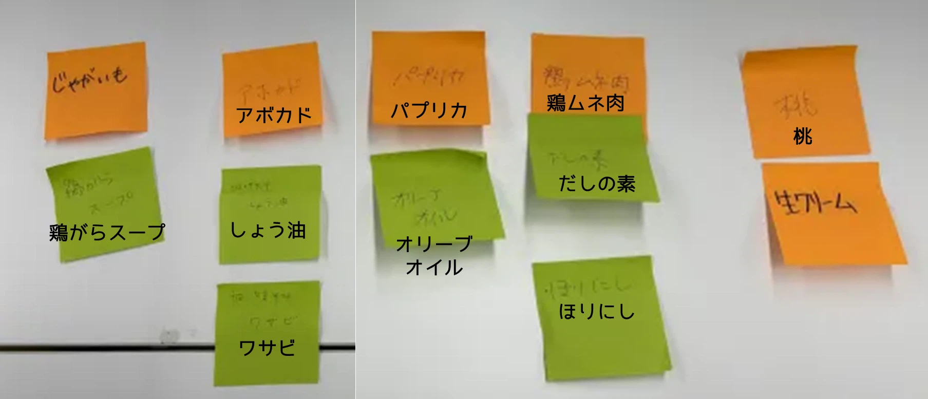 ①好きな食材を1人2~3個ポストイットに書いて、それを出し、その食材で料理を作る